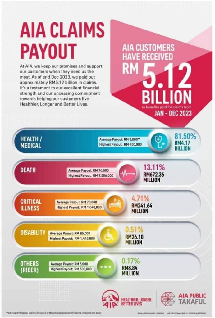 Ramai yang kata claim takaful susah, tapi tahukah anda berapa banyak sebenarnya syarikat takaful dah bayar kepada penyumbang mereka? Pada tahun 2023 sahaja, jumlah tuntutan takaful yang telah dibayar oleh syarikat AIA & AIA Public Takaful adalah RM5.12 Billion. Ini membuktikan bahawa syarikat takaful memang bayar tuntutan, selagi ia menepati syarat yang telah dipersetujui.